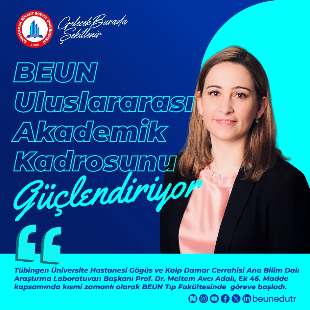 Zonguldak Bülent Ecevit Üniversitesi (BEUN), uluslararasılaşma vizyonu doğrultusunda akademik kadrosunu küresel ölçekte güçlendirmeye devam ediyor. Bu kapsamda Almanya’nın köklü yükseköğretim kurumlarından biri olan Tübingen Üniversite Hastanesi Göğüs ve Kalp Damar Cerrahisi Ana Bilim Dalı Araştırma Laboratuvarı Başkanı Prof. Dr. Meltem Avcı Adalı, 2547 Sayılı Yükseköğretim Kanunu’nun Ek 46. Maddesi kapsamında BEUN Tıp Fakültesine kısmi zamanlı öğretim üyesi olarak atandı.