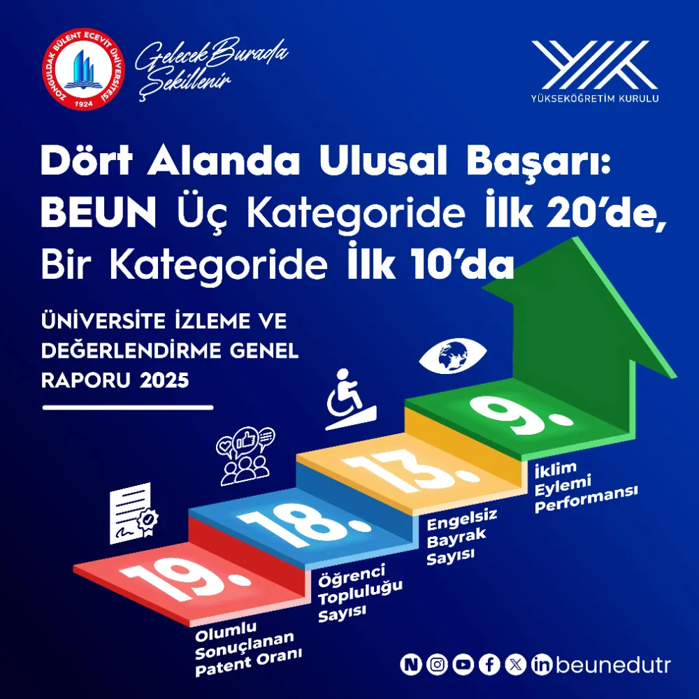 Zonguldak Bülent Ecevit Üniversitesi (BEUN), Yükseköğretim Kurulu (YÖK) tarafından yayımlanan “Üniversite İzleme ve Değerlendirme Genel Raporu-2025” sonuçlarına göre birçok alanda gösterdiği üstün performansla Türkiye genelinde dikkat çekici bir başarıya imza attı. Üniversite; inovasyon, öğrenci yaşamı, sürdürülebilirlik ve erişilebilirlik alanlarında elde ettiği sonuçlarla üç farklı göstergede ilk 20 üniversite arasına girerken, İklim Eylemi alanında ise Türkiye 9’uncusu oldu.