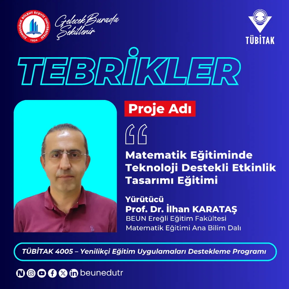 Zonguldak Bülent Ecevit Üniversitesi (BEUN) Ereğli Eğitim Fakültesi Matematik Eğitimi Ana Bilim Dalı akademisyenlerinden Prof. Dr. İlhan Karataş’ın yürütücülüğünü üstlendiği proje, Türkiye Bilimsel ve Teknolojik Araştırma Kurumu (TÜBİTAK) tarafından 4005 – Yenilikçi Eğitim Uygulamaları Destekleme Programı kapsamında destek almaya hak kazandı.