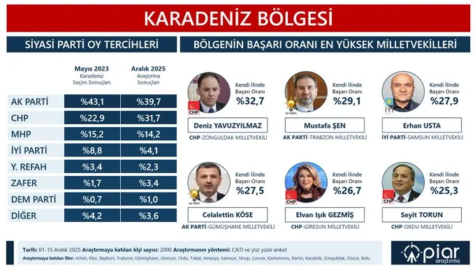 1–15 Aralık 2025 tarihleri arasında, 2 bin kişiyle CATI ve yüz yüze görüşme yöntemiyle gerçekleştirilen araştırmaya göre, Karadeniz Bölgesi’nin başarı oranı en yüksek milletvekili bir kez daha CHP Genel Başkan Yardımcısı ve Zonguldak Milletvekili Deniz Yavuzyılmaz oldu.