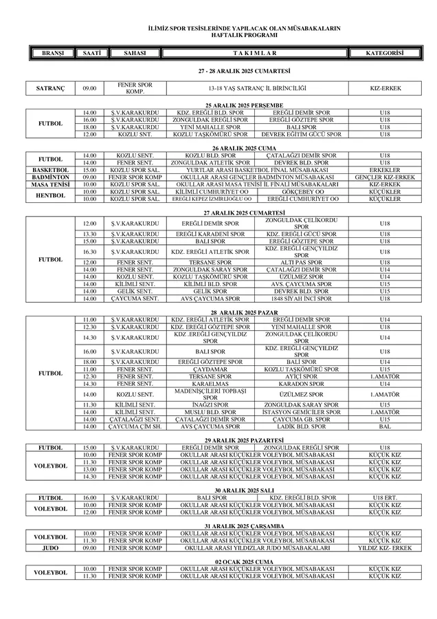 İLİMİZ SPOR TESİSLERİNDE YAPILACAK OLAN MÜSABAKALARIN HAFTALIK PROGRAMI
