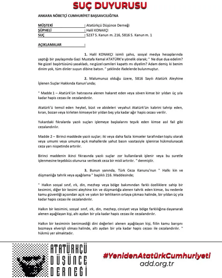 Halil Konakçı adlı hadsiz şahıs hakkında sosyal medya paylaşımında Atatürk’ün hatırasına hakaret ve halkı kin ve düşmanlığa tahrik edici ifadeleri nedeniyle yaptığımız