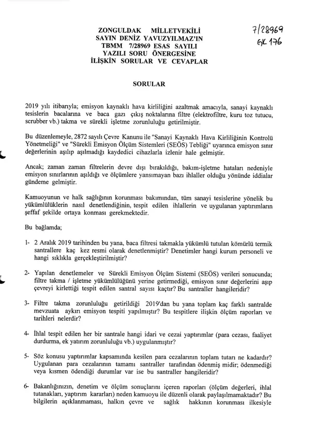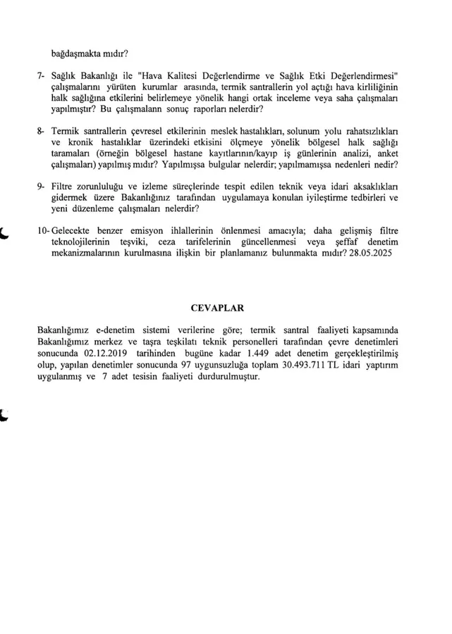 Cumhuriyet Halk Partisi (CHP) Genel Başkan Yardımcısı ve Zonguldak Milletvekili Deniz Yavuzyılmaz, bu iddiaları geçtiğimiz aylarda Meclis gündemine taşıyarak kapsamlı bir soru önergesi vermiş; santrallerin nasıl denetlendiğini, hangi ihlallerin tespit edildiğini ve bu tesislere ne tür yaptırımlar uygulandığını sormuştu.